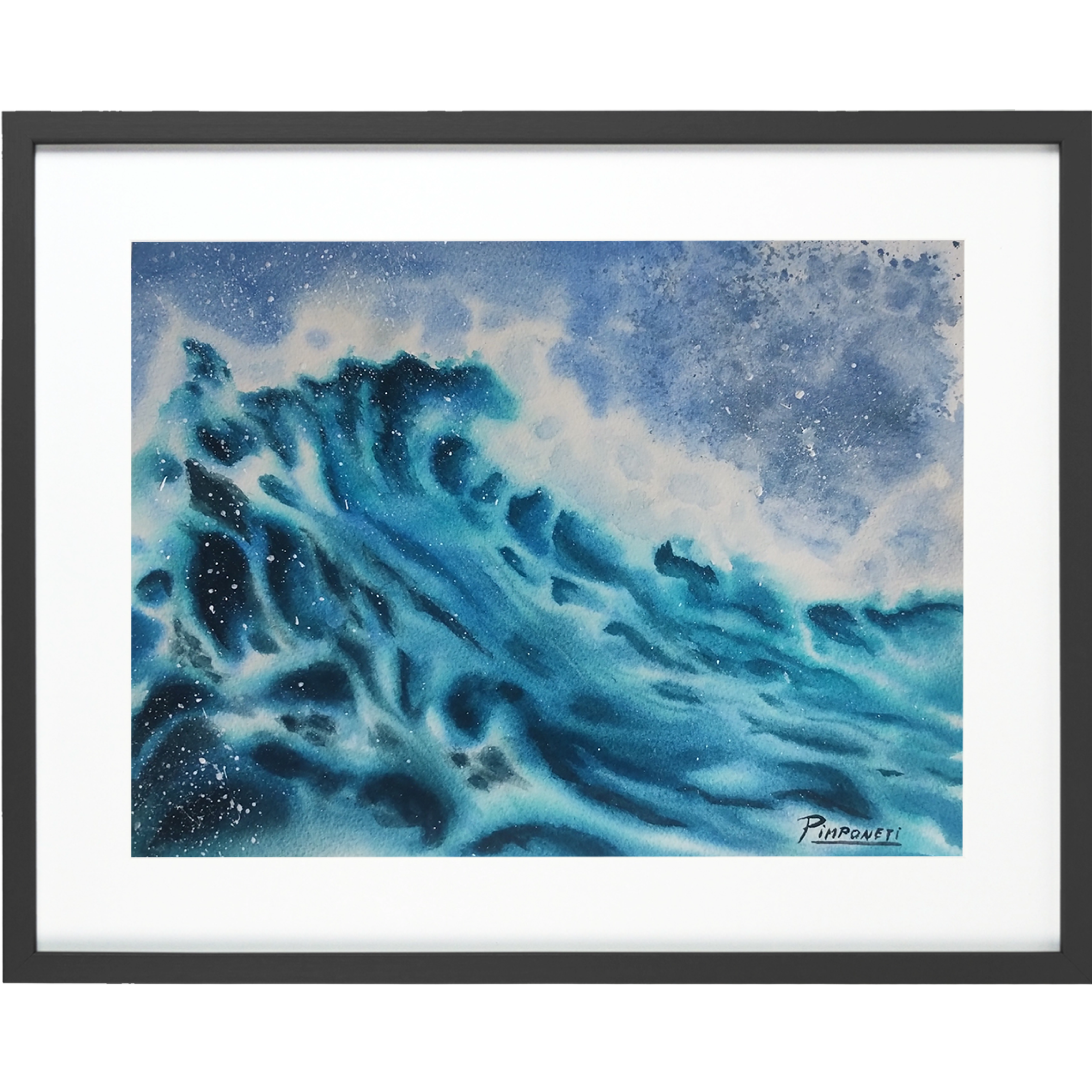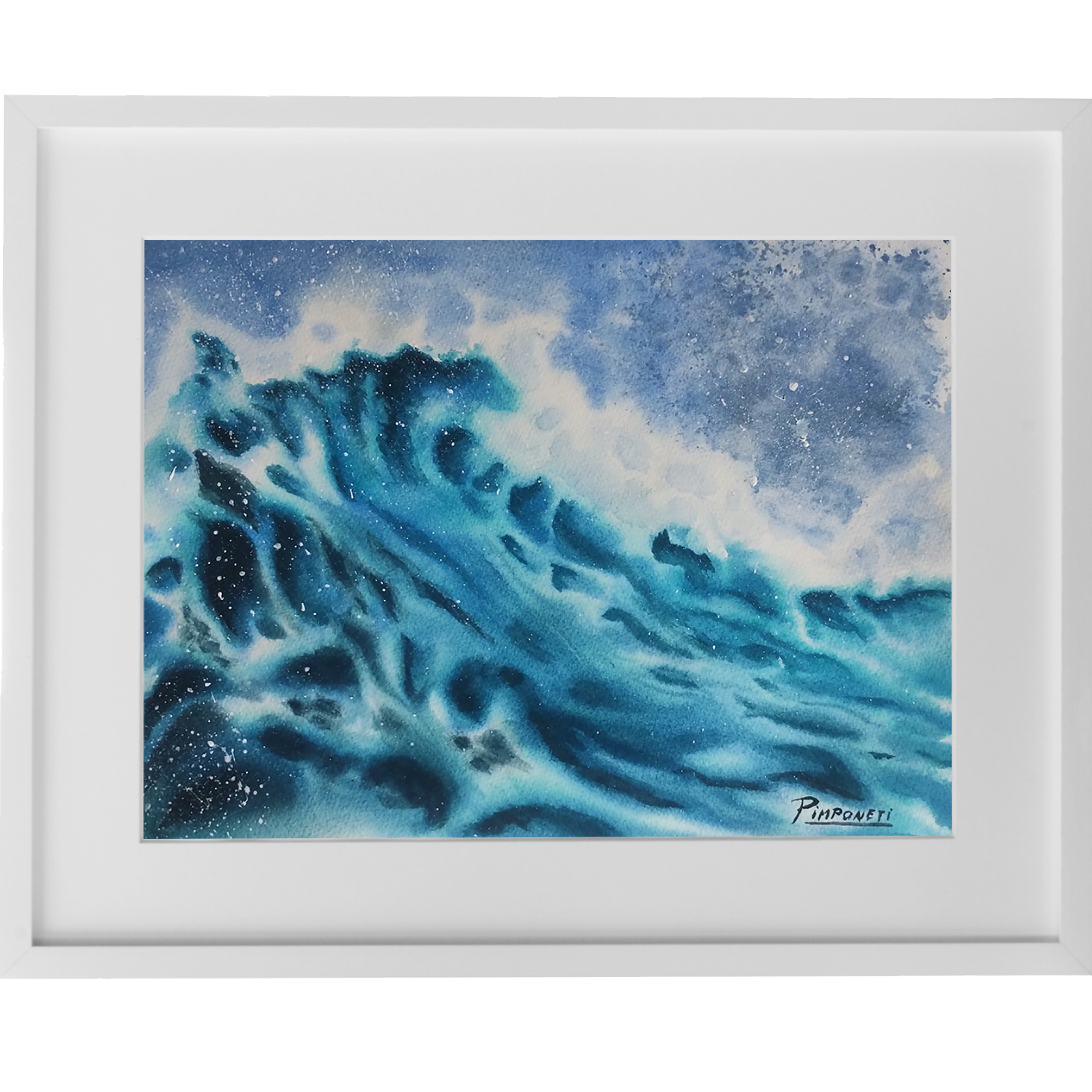 Una representación fluida y poderosa del mar en movimiento, donde la ola se eleva con fuerza y elegancia. La acuarela captura la energía del mar, sus tonos profundos y la espuma luminosa que transmite vida, dinamismo y calma a la vez.