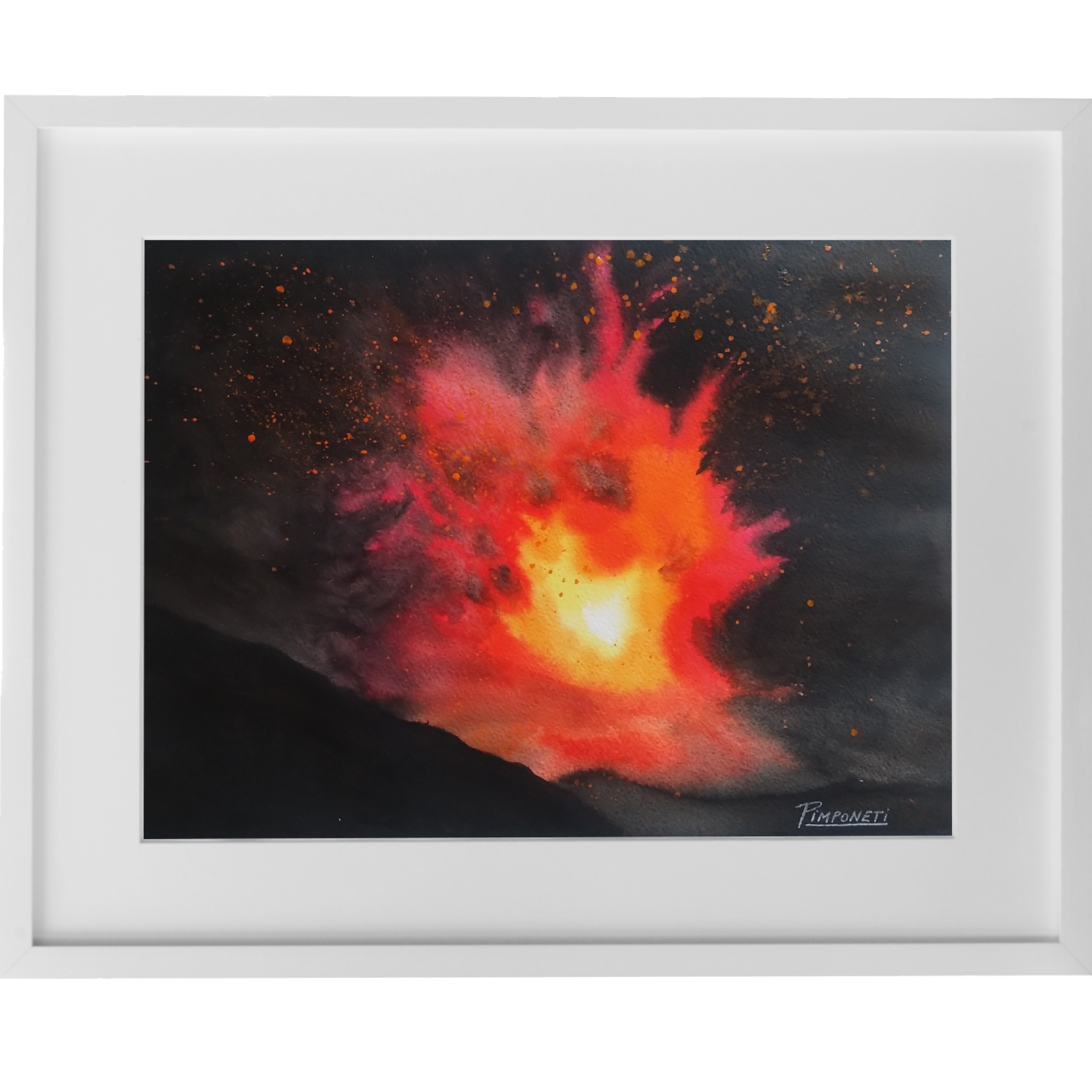 Una explosión de color y energía que emerge desde la oscuridad, representando la fuerza creativa que nace en los momentos de mayor intensidad. Esta acuarela captura el movimiento del fuego y sus destellos, mezclando tonos cálidos y sombras profundas en una composición llena de vida y dramatismo.