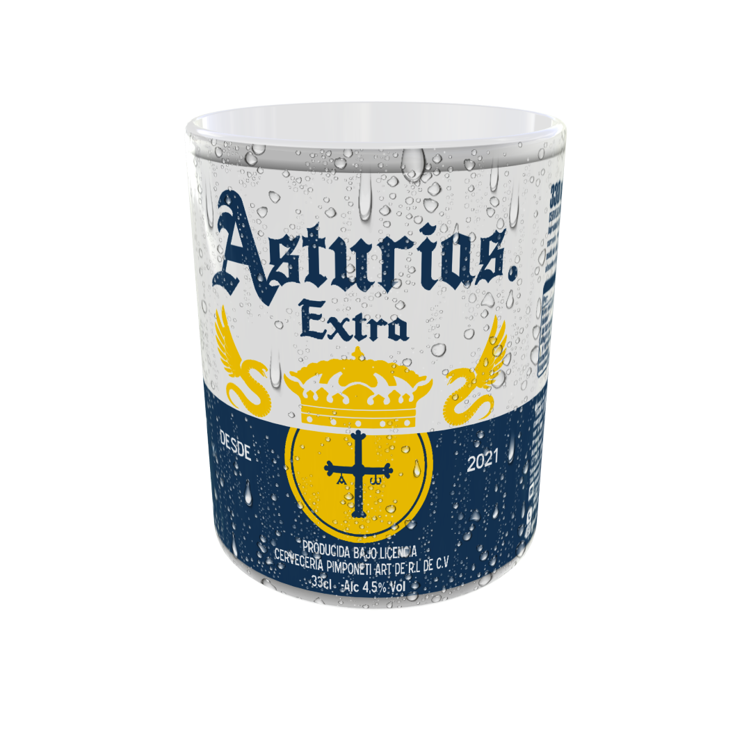 La Taza Asturias Extra reinterpreta el diseño de una clásica etiqueta cervecera con estilo asturiano. Su efecto de gotas y sus detalles gráficos la convierten en una pieza perfecta para amantes de la tierrina y del diseño retro.